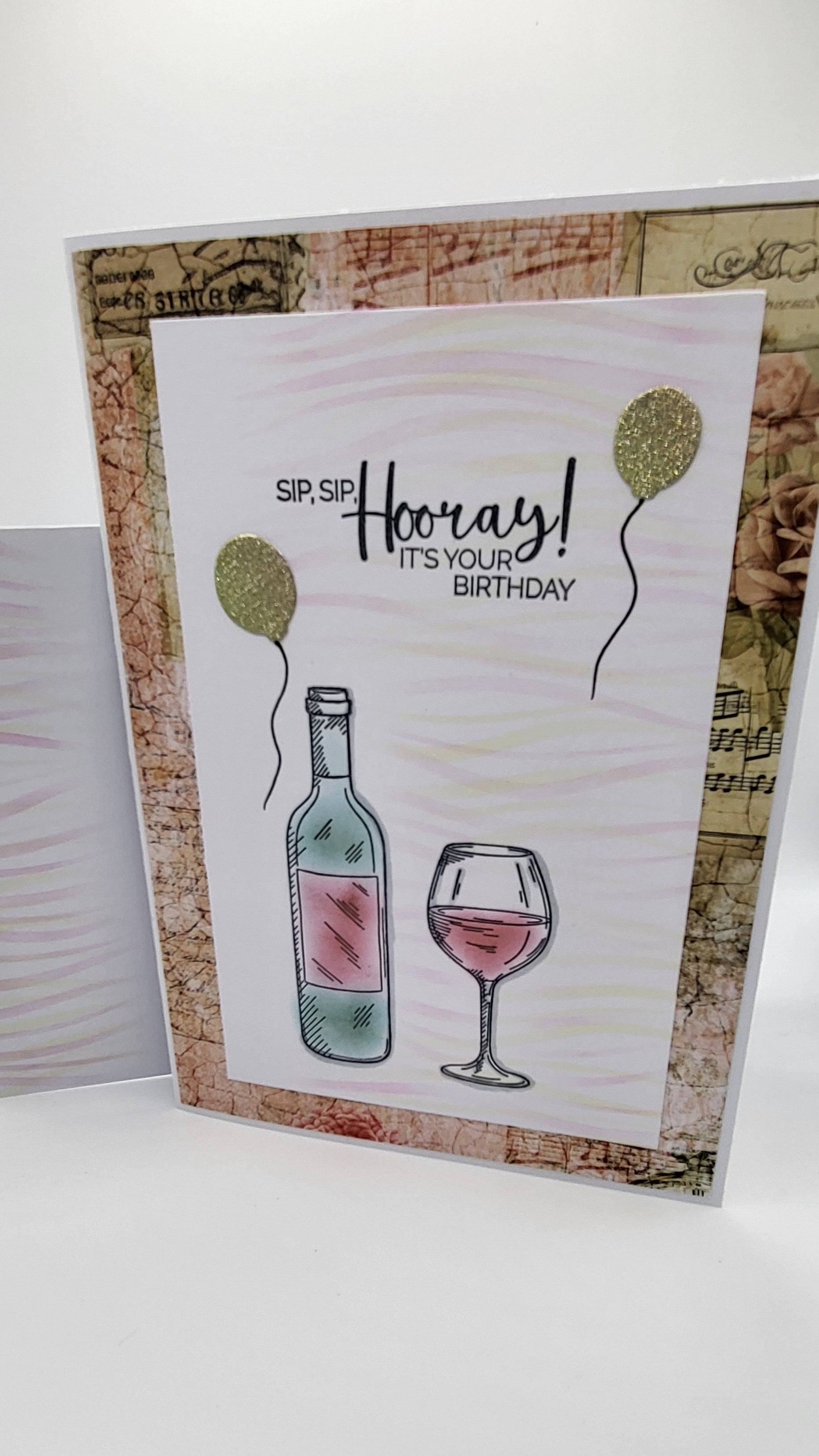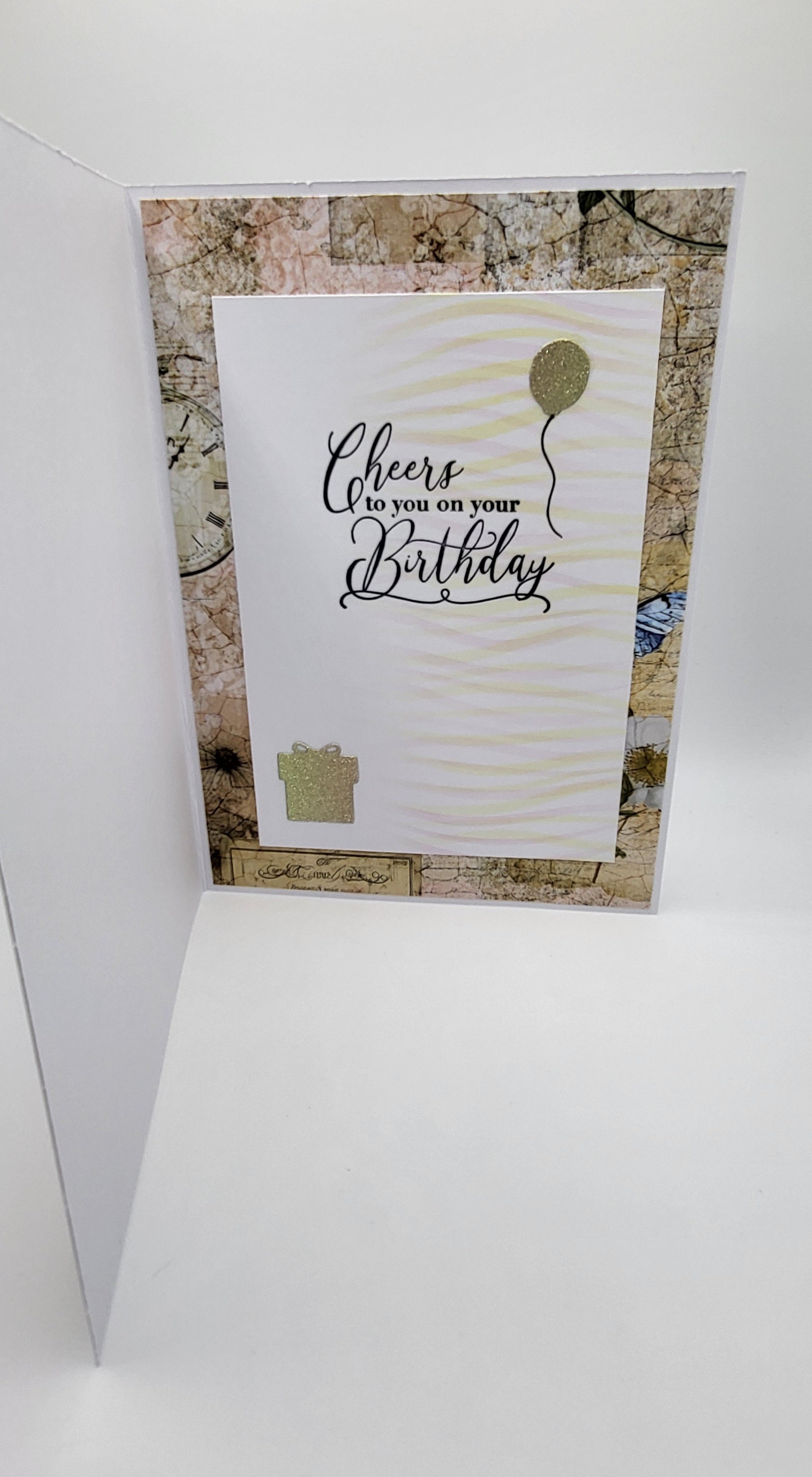 Item 1132 - Handmade 5x7 greeting card with coordinating envelope. Inside sentiment: Cheers to you on your birthday.