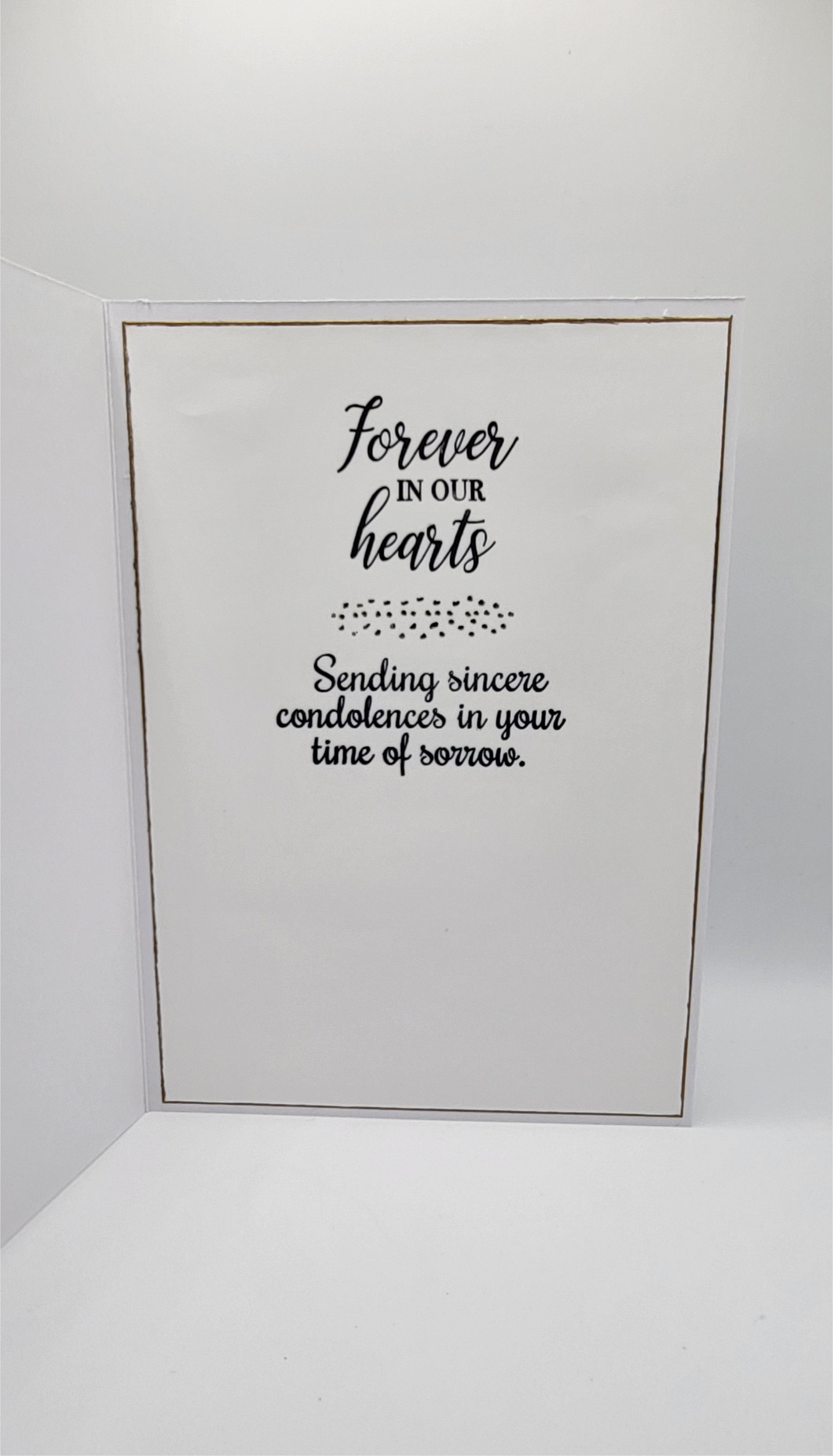 Item 1116 - Handmade 5x7 card with plain white envelope. Inside sentiment: Forever in our hearts. Sending sincere condolences in your time of sorrow.